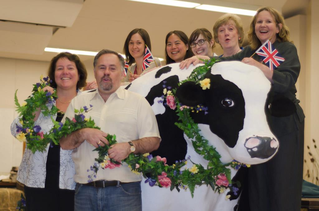 Michael Patrick Albano pictured to the left of the prop cow used in Laura’s Cow alongside CCOC staff and volunteers.